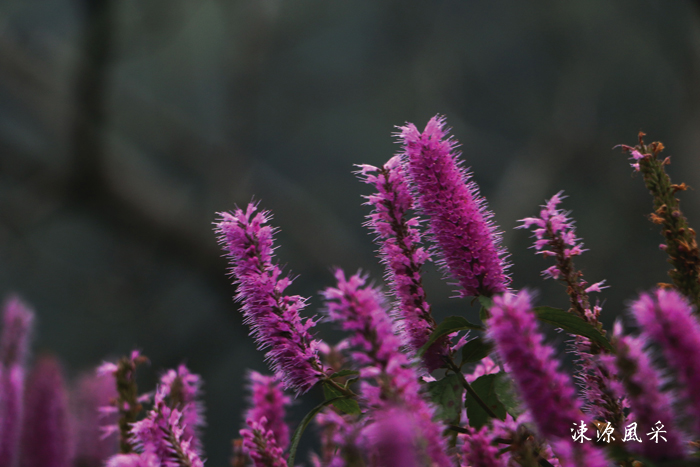 沿着溪水慢慢前行,紫红色的荆芥花渐入视野。先是一丛丛,一簇簇,然后是成片的花海,随着地势的高低起伏,层层叠叠的开满沟坡河谷,远看,象一片彩云飘落在山谷间。走进彩云的深处,细细欣赏这奇特的花树,你会发现:这里的荆芥是一种低矮的權木,紫红色的花穗象一根精巧的蜡烛,长约10厘米。一株荆芥就是一支硕大的烛台,上面擎着无数根燃烧的红烛,一峪的荆芥花就是一片燃烧的火焰,让沉寂的山谷炫丽如霞……