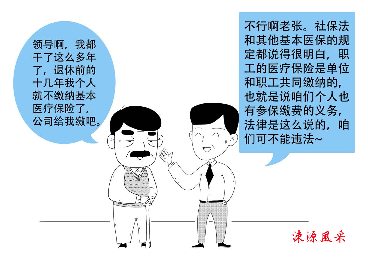 问3:张师傅在某企业连续工作20 年,是公司的老员工了。张师傅跟企业领导讲,我都干了这么多年了,退休前的10 几年我个人不缴纳基本医疗保险费了,公司缴费就行了。这样缴费行吗?
