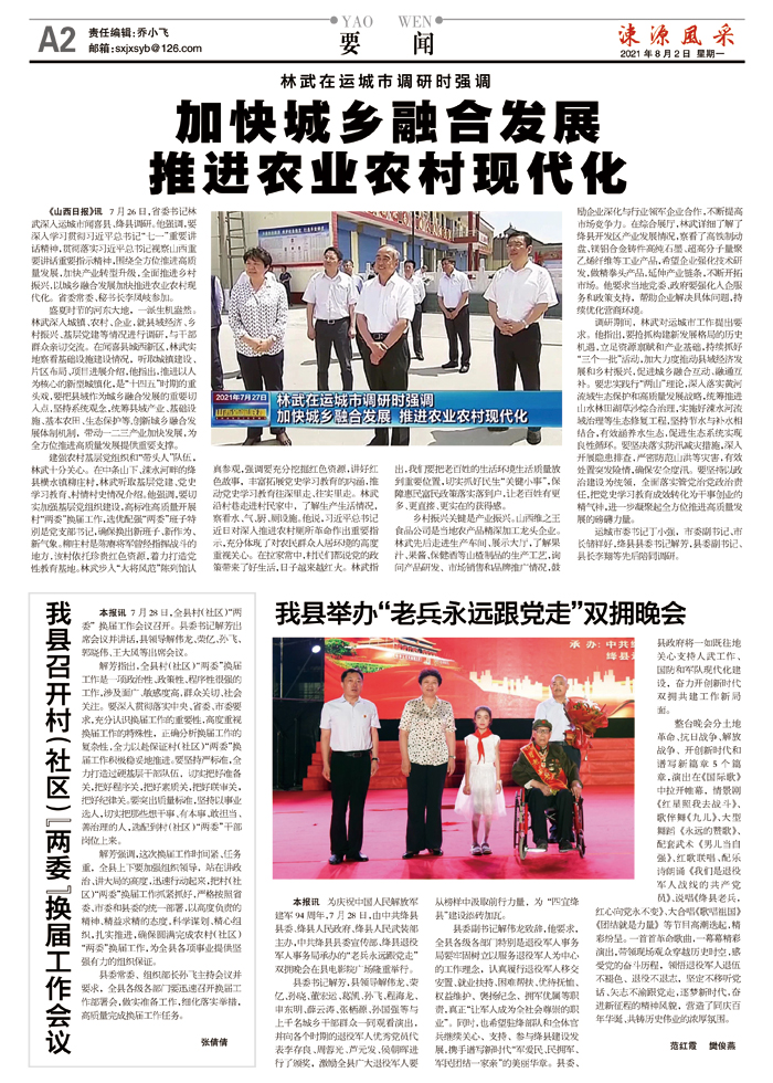 《山西日报》讯 7月26日,省委书记林武深入运城市闻喜县、绛县调研。他强调,要深入学习贯彻习近平总书记“七一”重要讲话精神,贯彻落实习近平总书记视察山西重要讲话重要指示精神,围绕全方位推进高质量发展,加快产业转型升级,全面推进乡村振兴,以城乡融合发展加快推进农业农村现代化。省委常委、秘书长李凤岐参加。
