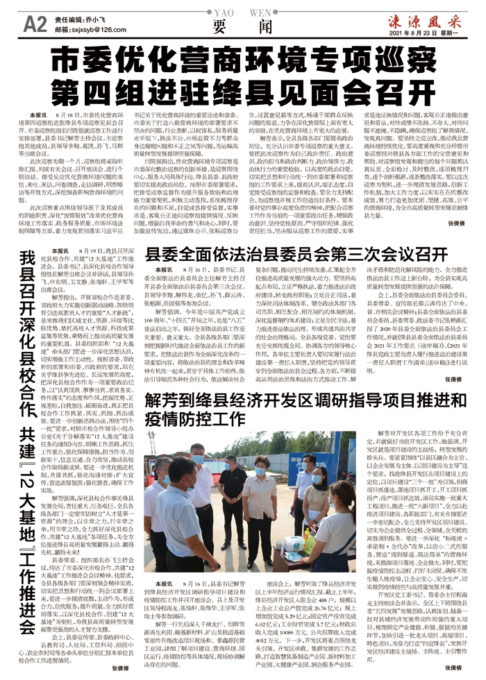 本报讯 8月18日,市委优化营商环境第四巡察组进驻绛县专项巡察见面会召开。市委巡察组组长闫筱强就巡察工作进行安排部署,县委书记解芳主持会议,市巡察组其他成员,县领导李翔、葛凯、孙飞、马辉等出席会议。