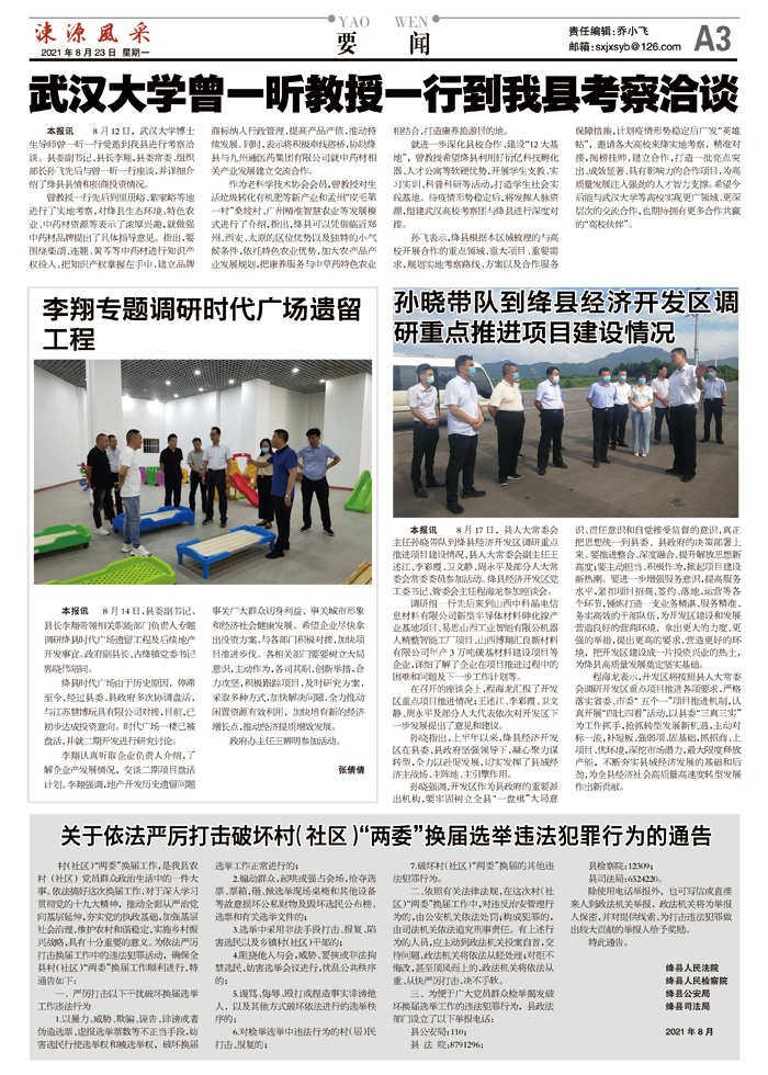 本报讯 8月14日,县委副书记、县长李翔带领相关职能部门负责人专题调研绛县时代广场遗留工程及后续地产开发事宜。政府副县长、古绛镇党委书记郭晓伟陪同。
