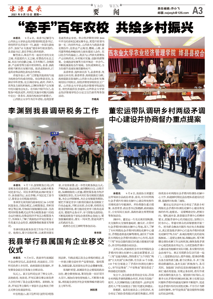山西农业大学作为百年老校,是我国著名高等农业学府,农业经济管理学院2000年开设的农村区域发展专业,更是目前省内独一无二的学科专业。山西农大与我县有着长期合作,在农业产业规划、樱桃、山楂、食用菌等特色种植培育方面有着深入合作。在以往合作的基础上,我县与山西农大将聚焦产业结构优化、乡村振兴实施、创新资源聚集、全域旅游发展等方面开展进一步合作,不断拓展县校合作领域,加快成果转化,全方位提升县域发展质量和水平。