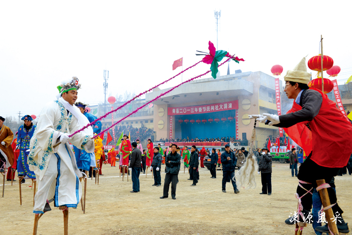 绛县高跷,俗称“拐子”。由舞者踩在木跷上表演,在绛县流行时间较长,以磨里镇焦家洼村、古绛镇城内村较为驰名。木跷高度不一,有的低至一尺多,有的高达一丈五尺,一般为四、五尺。高跷有文高跷、武高跷之分。文高跷用弦乐伴奏,边走边舞,变换各种队形,在街道上表演,舞者有的化装为戏剧人物,既表现历史故事,也表现现代生活,内容丰富多彩,不拘一格。武高跷用打击乐伴奏,以表演特技为主,专门设置场地, 表演的特技有“过天桥”、“跌八叉”、“跳桌子”、“跳双凳’等,颇有武术色彩。有的除了磕拐、碰拐、跌叉、跳桌等特技表演外,还有抬二节、抬三节、坐抬、上抬、组合抬等高难抬法,把惊险的表演与优美的造型艺术融合为一体,惊险紧张,动人心魄。