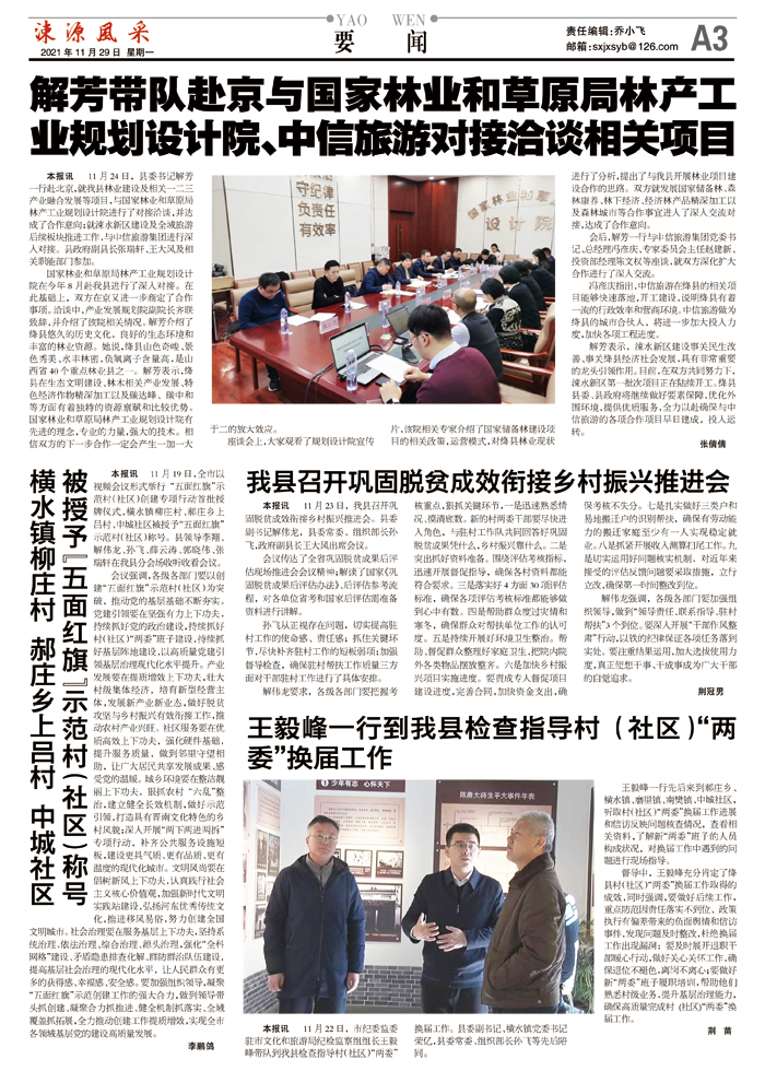 本报讯 11月24日,县委书记解芳一行赴北京,就我县林业建设及相关一二三产业融合发展等项目,与国家林业和草原局林产工业规划设计院进行了对接洽谈,并达成了合作意向;就涑水新区建设及全域旅游后续板块推进工作,与中信旅游集团进行深入对接。县政府副县长张瑞轩、王大风及相关职能部门参加。