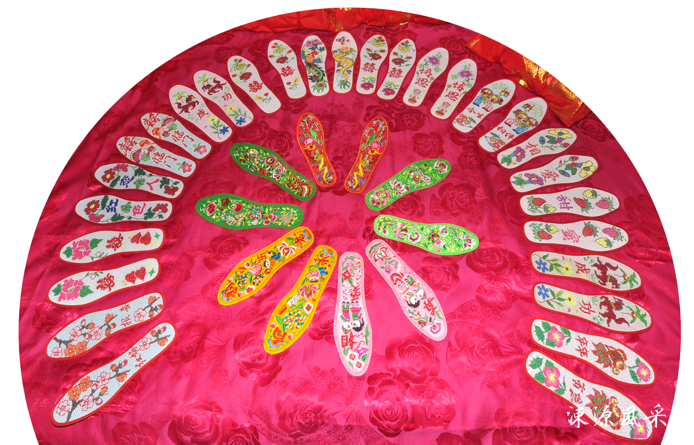 绛县刺绣是先前家庭妇女们必须做的“针线活儿”,它与布扎有相似之处,但又不尽相同。常见的有信札、枕套、围裙、绣花鞋、绣荷包、衣服花边、鞋垫等,内容多为吉祥的词语配以鲜花图案。绛县刺绣缩千里于尺幅,绣万趣于指下,山水能分远近之趣,楼阁能得深邃之体,人物能具瞻眺之情,花鸟能具绰约亲昵之态,图案精美,赞誉不断。毛家坡村王春莲创作出近百幅生活气息浓厚、异彩纷呈的鞋垫图,既有妩媚动人的各种花儿,又有千姿百态的十二生肖,还有象征着吉祥如意的 “龙凤配”等,每图皆新,从不重复。苦绘数月,终于完成。在2008年北京奥运会前寄达北京,表达自己的祝贺之情。《山西日报》等报纸作了报道。随着时代发展,绛县民间刺绣正走出山乡,走进都市,成为城里人争相购买的装饰品。