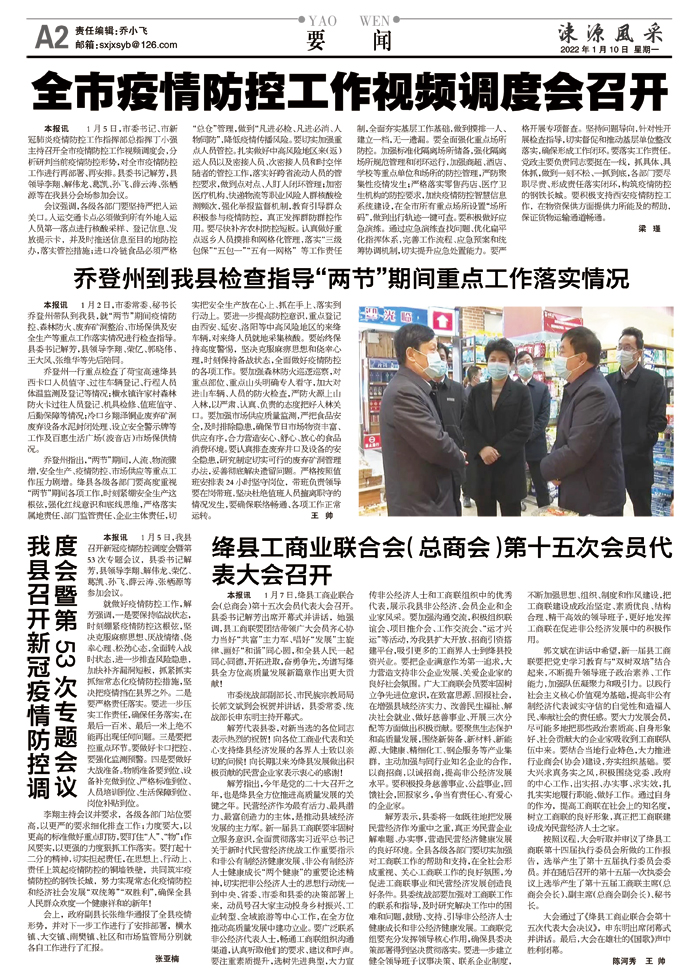 乔登州指出,“两节”期间,人流、物流骤增,安全生产、疫情防控、市场供应等重点工作压力剧增。绛县各级各部门要高度重视“两节”期间各项工作,时刻紧绷安全生产这根弦,强化红线意识和底线思维,严格落实属地责任、部门监管责任、企业主体责任,切实把安全生产放在心上、抓在手上、落实到行动上。要进一步提高防控意识,重点登记由西安、延安、洛阳等中高风险地区的来绛车辆,对来绛人员就地采集核酸。要始终保持高度警惕,坚决克服麻痹思想和侥幸心理,时刻保持备战状态,全面做好疫情防控的各项工作。要加强森林防火巡逻巡察,对重点部位、重点山头明确专人看守,加大对进山车辆、人员的防火检查,严防火源上山入林,以严肃、认真、负责的态度把好入林关口。要加强市场供应质量监测,严把食品安全,及时排除隐患,确保节日市场物资丰富、供应有序,合力营造安心、舒心、放心的食品消费环境。要认真排查废弃井口及设备的安全隐患,研究制定切实可行的废弃矿洞管理办法,妥善彻底解决遗留问题。严格按照值班安排表24小时坚守岗位,带班负责领导要在岗带班,坚决杜绝值班人员擅离职守的情况发生,要确保联络畅通、各项工作正常运转。