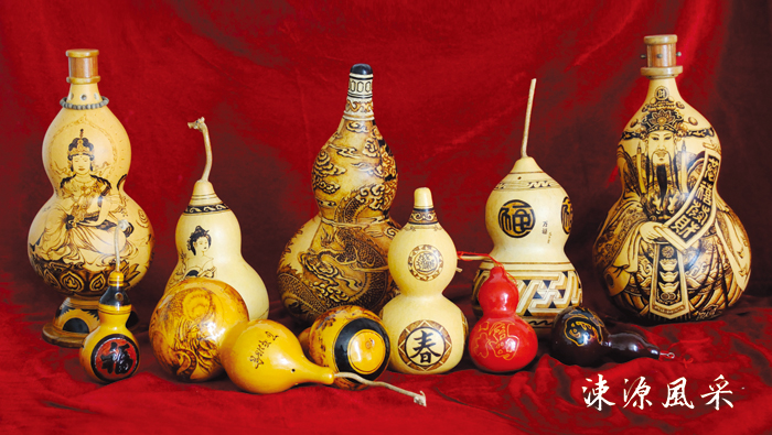 葫芦是由圆构成的,象征着和谐美满。不但在古代绛县人民的物质生活中占有重要地位,而且与文学、艺术、宗教、民俗、神话传说乃至政治等关系也十分密切,围绕葫芦形成的种种意识形态,无疑是构成绛县传统文化的一个重要组成部分。千百年来,葫芦作为一种吉祥物和观赏品,一直受到人们的喜爱和珍藏,是中华吉祥文化的代表象征。绛县的葫芦艺术主要有两类:一类是火画葫芦,又名火绘,火笔或者烫花葫芦。以申王坡村的张金燕、卓子沟村的曹志文为代表。利用灼热的工具在葫芦表面的木质层上,烙烫出焦枯痕迹形成图案。工具有新旧两种,新者用电笔,旧者用火香及火针。另一类是针(刀)刻葫芦,就是以针或刀在葫芦上刻划表现各种图案。针刻葫芦采取的是圆球状的小型葫芦,所刻文字图案精微。其格局图案性强,较多的是以环形图案作顶部和底部的纹饰,腹部以直线作均等分割,便构成若干画面空间,其间或刻画、或刻书,也有针刻书画并茂的。针刻葫芦中的精品,属微雕一类。而刀刻葫芦或系浅刻阴文花纹,或缕刻透雕图案。花纹均为以线刻、点刻组成的图案。刀法流畅,线条飞动,具有粗狂醇朴的情趣。以中信机电公司17厂的干部王学哲为代表。他们以历史或现代题材为基础,全凭纯朴的感情与直觉的印象去创作,因此形成葫芦艺术浑厚、单纯、简洁、明快的特殊风格,反映了故绛人民那种朴实无华的精神。