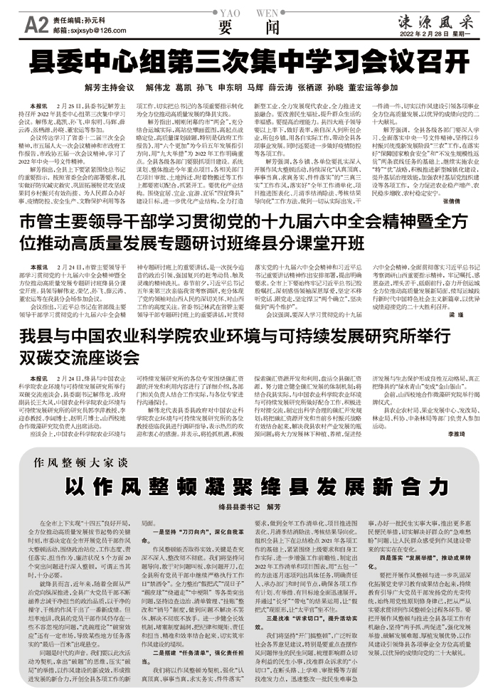 要把开展作风整顿与进一步巩固深化拓展党史学习教育成果结合起来,持续教育引导广大党员干部发扬党的光荣传统,始终用党性原则修身律己,把从严从实要求贯彻到作风整顿全过程各环节。要把开展作风整顿与推进全县各项工作有机融合,坚持“两手抓、两促进”,强化发展举措、破解发展难题、厚植发展优势,以作风建设引领绛县各项事业全方位高质量发展,以优异的成绩向党的二十大献礼。