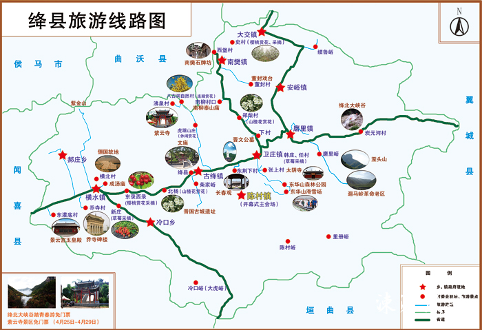 赏花路线:1、绛县横水高速口下,沿沁东线(闻喜县东镇至沁水县)绛县方向,十分钟路程即到古绛镇北杨村,沿途即可赏花