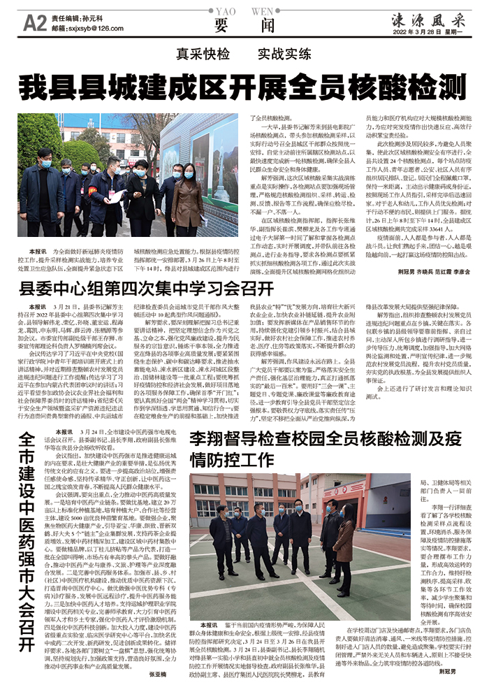 解芳要求,要深刻理解把握习总书记重要讲话精神,把坚定理想信念作为兴党之基、立命之本,强化党风廉政建设,提升为民服务的宗旨意识,锤炼干事本领,全力推进党在绛县的各项事业高质量发展;要紧紧围绕生态保护、碳中和碳达峰要求,推进抽水蓄能电站、涑水新区建设、涑水河城区段整治、国储林建设等一批重点工程;要统筹抓好疫情防控和经济社会发展,做好项目落地的各项服务保障工作,确保首季“开门红”;要认真抓好全国“两会”精神学习贯彻,切实作到学深悟透、学思用贯通、知信行合一;要在稳定粮食生产的前提和基础上,加快推进我县农业“特”“优”发展方向,培育壮大新兴农业企业,加快农业补链延链,提升农业附加值;要发挥新媒体在产品销售环节的作用,持续强化党建引领乡村振兴,结合县域实际,做好农村社会保障工作,推进农村养老、医疗、住房等政策落实,不断提升群众的获得感幸福感。