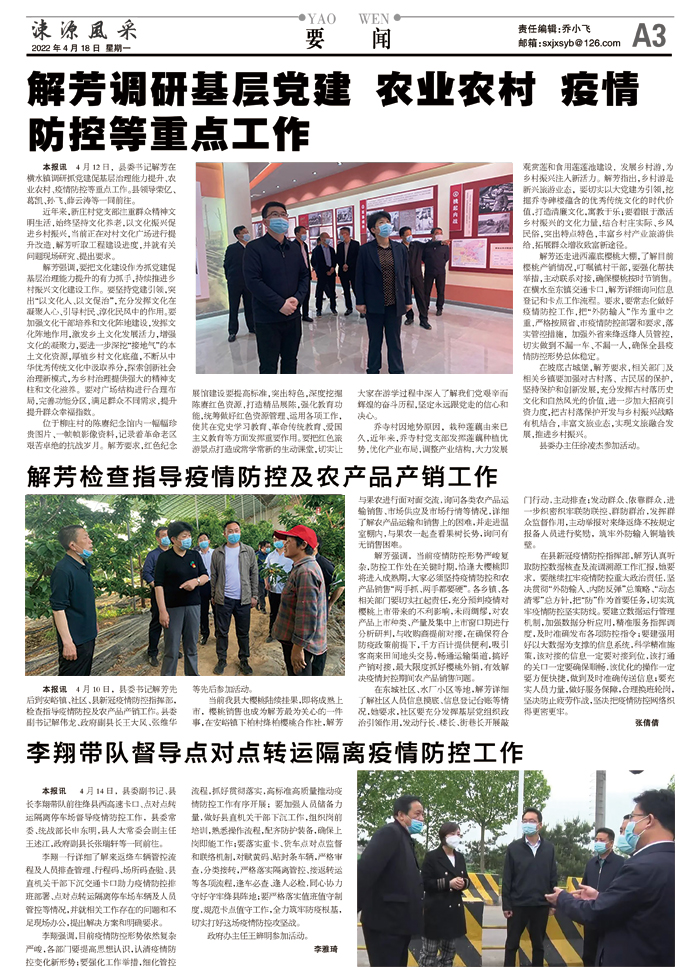 解芳调研基层党建 农业农村 疫情防控等重点工作