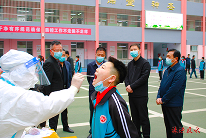 本报讯 4月14日,县委常委、组织部长孙飞到县直初中实地察看学校核酸检测采样现场,详细了解核酸检测进度和疫情防控各项措施。