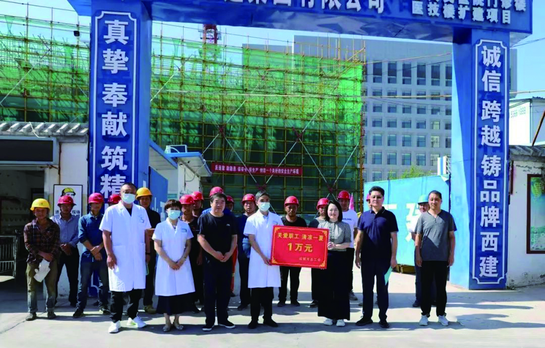 在绛县人民医院改扩建项目施工现场,宋沛颖向战高温斗酷暑、坚守一线的广大职工表示亲切慰问,并送上1万元慰问金。她强调,要以人为本、促进和谐、安全生产,切实关心户外职工的身体健康和劳动安全,进一步落实好各项防暑降温和劳动安全保障措施,确保工人平安度夏。并对职工勇于奉献、坚守岗位的精神予以赞扬,对他们兢兢业业的工作态度给予肯定,为他们所付出的辛勤劳动表示感谢。