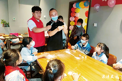 活动中,志愿者们通过图片展示、故事讲述、古诗朗诵等多种方式,逐步引导小朋友了解中秋节的来历及典故,讲解月饼的制作流程。揉面团、包馅、放模具内按压成型,在老师的指导下,大家迫不及待地拿起了原材料和工具,按步骤一步步完成了月饼的制作。