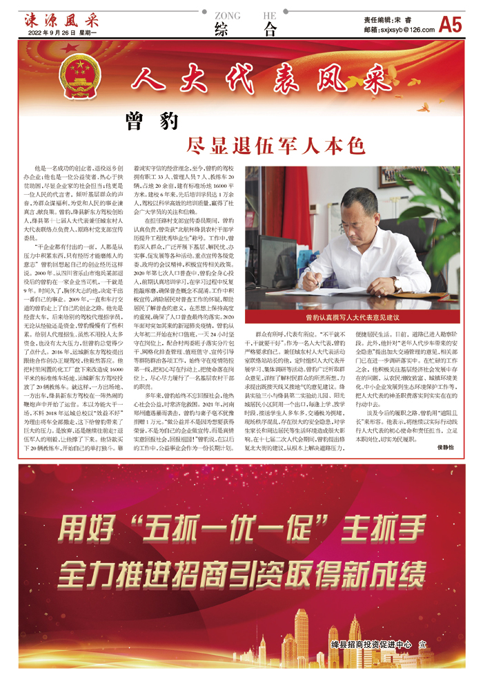 群众有所呼,代表有所应。“不干就不干,干就要干好”。作为一名人大代表,曾豹严格要求自己。兼任城东村人大代表活动室联络站站长的他,定时组织人大代表开展学习、集体调研等活动。曾豹广泛听取群众意见,详细了解村民群众的所思所想,力求提出既接天线又接地气的意见建议。绛县实验三小与绛县第二实验幼儿园、阳光城居民小区同用一个出口,每逢上学、放学时段,接送学生人多车多,交通极为拥堵,现场秩序混乱,存在很大的安全隐患,对学生家长和周边居民等生活环境造成很大影响。在十七届二次人代会期间,曾豹提出修复北大街的建议,从根本上解决道路压力,便捷居民生活。目前,道路已进入勘察阶段。此外,他针对“老年人代步车带来的安全隐患”提出加大交通管理的意见,相关部门已在进一步调研落实中。在忙碌的工作之余,他积极关注基层经济社会发展中存在的问题,从农民增收致富、城镇环境美化、中小企业发展到生态环境保护工作等,把人大代表的神圣职责落实到实实在在的行动中去。