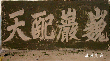 “巍严配天”石匾镶至尧王的全神庙内。该庙遗址座落在村南一公里许的山坡上,庙宇虽然早年已毁,荒草颓垣,残破不堪,但庙基尚存,占地较大,足见当时之规模。石匾是从密密连连的杂草丛中发现的,137厘米,高76厘米,厚12厘米,阴刻“巍严配天”四字。专家讲,其中的“天”,正是“尧天”的简略。