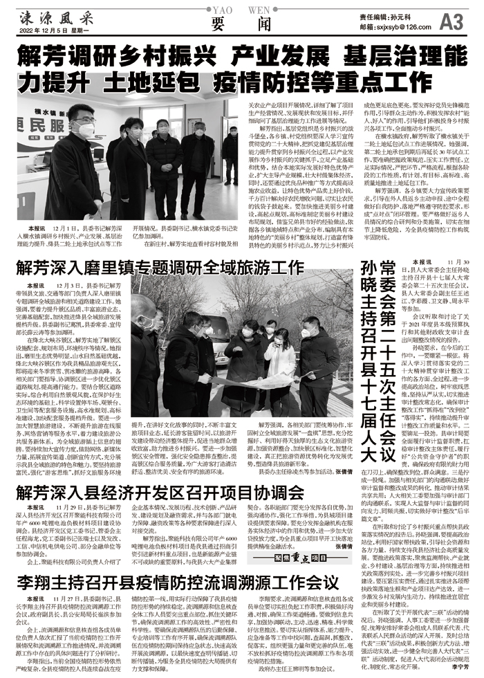 解芳调研乡村振兴 产业发展 基层治理能力提升 土地延包 疫情防控等重点工作