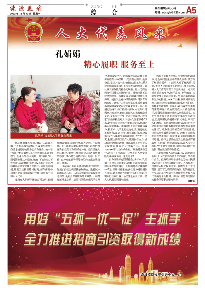 作为人大代表的她,平常与客户沟通中,也会询问在生活中有什么困难,多方面了解群众需求,广泛深入地了解民情、民意,关注人民群众关心的热点,难点问题,将人大工作与本职工作完美结合。她及时反映群众的呼声,敢干直言、善于献言,切实维护群众的合法利益,努力不辜负群众和客户的信任。2018年以来,里册村南坡约300余亩坡地全部栽植连翘树,村民们除了连翘果的收益外,到春天,漫山遍野的连翘花更是将这片坡地渲染成一片黄色的海洋,吸引周边游客纷纷来这里观赏游览。在此处打造观光游生态园有极高的经济价值,但是周围的的道路却极其难走,不利于人们通行。孔娟娟现场调研后,提出“关于硬化里册村南坡连翘观光旅游生态园道路的建议”,收到建议后相关部门高度重视,目前已经将道路全部硬化。2021年连续的大雨致使里册村、涧东村30余米的道路损坏垮塌,给下方居民住房及生活造成严重威胁,孔娟娟了解到此情况后,在人代会上提出“关于修复里册村、涧东村中道路”的建议,现在该路段得到修复。