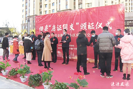 活动中,县自然资源局负责人介绍了绛县“房证同交”的整体工作情况,乾新房地产开发有限公司负责人作表态发言,与会领导为20户业主颁发了不动产证书。