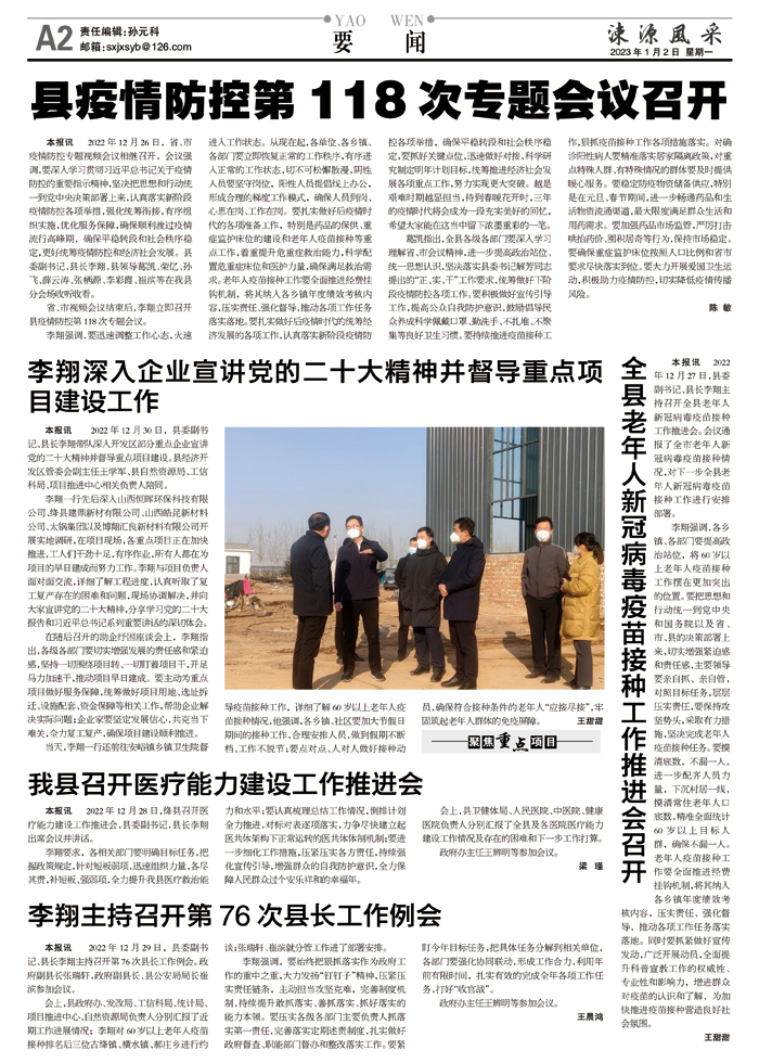 李翔要求,各相关部门要明确目标任务,把握政策规定,针对短板弱项,迅速组织力量,各尽其责,补短板、强弱项,全力提升我县医疗救治能力和水平;要认真梳理总结工作情况,倒排计划全力推进,对标对表逐项落实,力争尽快建立起医共体架构下正常运转的医共体体制机制;要进一步细化工作措施,压紧压实各方责任,持续强化宣传引导,增强群众的自我防护意识,全力保障人民群众过个安乐祥和的幸福年。