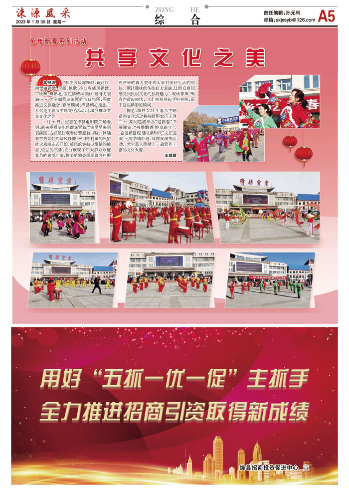 据悉,绛县2023年春节主题系列文化活动将持续到农历正月二十,期间还将举办“迎新春”书画展览、“书墨飘香 悦享新年”、“奋进新征程 建功新时代”文艺巡演、元宵节猜灯谜、戏曲展演等活动,为全县人民献上一道营养丰富的文化大餐。