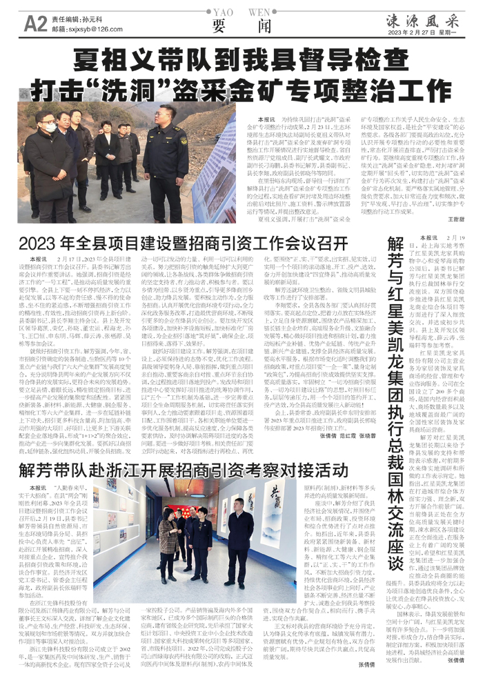 本报讯 2月17日,2023年全县项目建设暨招商引资工作会议召开。县委书记解芳出席会议并作重要讲话。她强调,招商引资是经济工作的“一号工程”,是推动高质量发展的重要引擎。全县上下要一刻不停抓经济,全力以赴促发展,以等不起的责任感、慢不得的使命感、坐不住的紧迫感,不断增强招商引资工作的精准性、有效性,推动招商引资再上新台阶。县委副书记、县长李翔主持会议。县上及开发区领导葛凯、荣亿、孙晓、董宏运、程海龙、孙飞、王虓恒、申东明、马辉、薛云涛、张栖源、吴栋等参加会议。