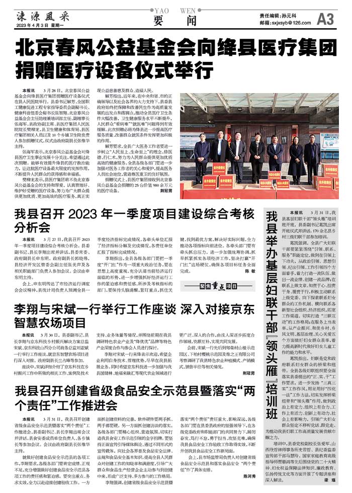 本报讯 3月28日,北京春风公益基金会向绛县医疗集团捐赠医疗设备仪式在县人民医院举行。县委书记解芳,全国职工健康促进工程专家指导委员会副秘书长、健康科普组委会秘书长张智翔,北京春风公益基金会主任助理兼培训部主任、副理事长张海军,县政协副主席、县医疗集团人民医院院长樊柳龙,县卫生健康和体育局、县医疗集团相关人员以及10个乡镇卫生院负责人参加捐赠仪式。仪式由政府副县长张维华主持。