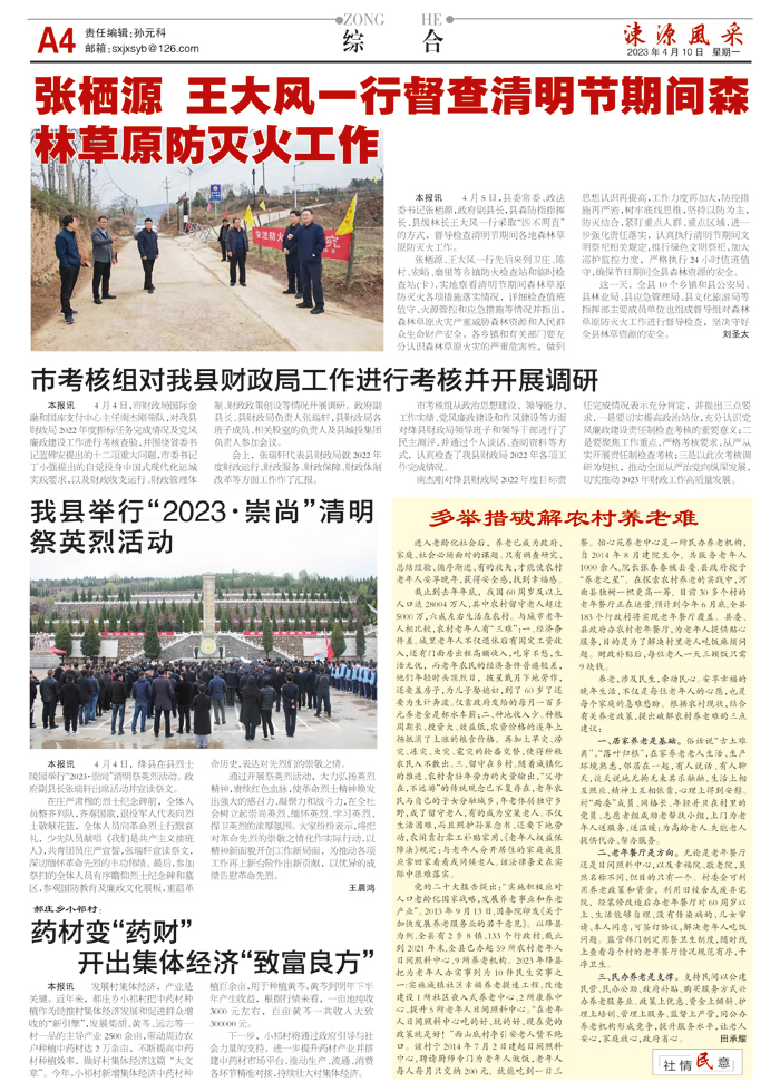 张栖源、王大风一行先后来到卫庄、陈村、安峪、磨里等乡镇防火检查站和临时检查站(卡),实地察看清明节期间森林草原防灭火各项措施落实情况,详细检查值班值守、火源管控和应急措施等情况并指出,森林草原火灾严重威胁森林资源和人民群众生命财产安全,各乡镇和有关部门要充分认识森林草原火灾的严重危害性,做到思想认识再提高,工作力度再加大,防控措施再严密,树牢底线思维,坚持以防为主,防灭结合,紧盯重点人群、重点区域,进一步强化责任落实,认真执行清明节期间文明祭祀相关规定,推行绿色文明祭祀,加大巡护监控力度,严格执行24小时值班值守,确保节日期间全县森林资源的安全。