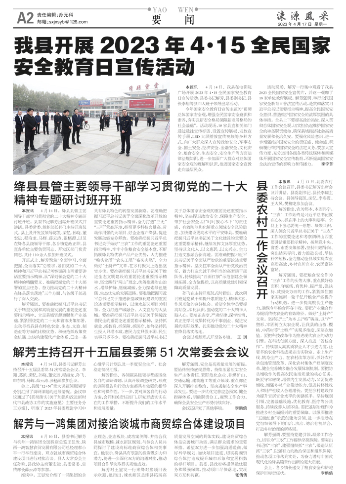 解芳强调,要准确把握习近平总书记关于转型发展和高质量发展的重要论述重要指示精神,立足县域资源禀赋和产业基础,紧紧围绕党的二十大和省市决策部署,主动寻找我县在特色农业、生态、文旅、制造业等方面的比较优势,积极抢抓政策资金机遇,加快构建现代产业体系,蹚出一条具有绛县特色的转型发展新路。要准确把握习近平总书记关于全面深化改革开放的重要论述重要指示精神,全力打造“三无”“三可”营商环境,招引更多科技含量高、带动作用强的大项目、好企业落户绛县,促进发展动能充分释放。要准确把握习近平总书记关于做好“三农”工作的重要论述重要指示精神,牢牢守住粮食安全基本盘,不断拓展绛县特优农产品产业优势,大力推进“粮头食尾”“农头工尾”“畜头肉尾”,全力做好“土特产”文章,在乡村振兴上迈出坚实步伐。要准确把握习近平总书记关于推进生态文明建设的重要论述重要指示精神,坚定践行“两山”理念,统筹推进治山治水、增绿护绿、低碳减碳,全力探索绿色低碳、生态优先的发展道路。要准确把握习近平总书记关于推进新型城镇化建设的重要论述重要指示精神,以涑水新区项目为引领,全力打造产城融合、人文宜居的大县城。要准确把握习近平总书记关于保障改善民生的重要论述重要指示精神,坚持抓就业、抓教育、抓保障、抓医疗,始终坚持民生投入只增不减、惠民力度只强不弱、民生实事只多不少。要准确把握习近平总书记关于总体国家安全观的重要论述重要指示精神,坚决捍卫政治安全、保障生产安全、维护社会安全,以“时时放心不下”的责任感,有效防范和化解重点领域安全风险隐患,加快建设更高水平的平安绛县。要准确把握习近平总书记关于文化建设的重要论述重要指示精神,继续发挥文脉厚重优势,坚持以文化人、以文惠民、以文兴业,全力打造文旅融合新高地。要准确把握习近平总书记关于全面从严治党的重要论述重要指示精神,坚决扛牢全面从严治党政治责任,着力打造忠诚干净担当的高素质干部队伍,持续推动“五面红旗”示范创建全领域拓展、全方位提质,以高质量党建引领保障高质量发展。