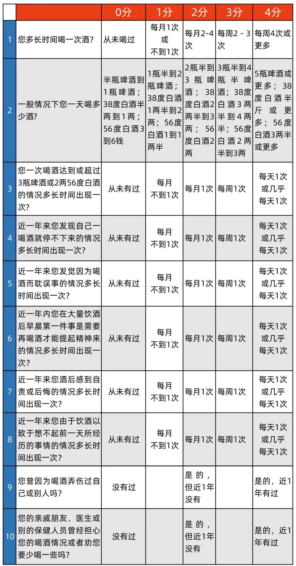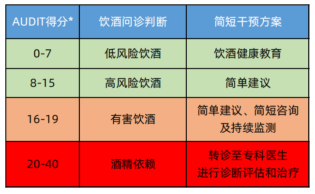 来做个简单小测试,这里为大家准备了WHO制定的《酒精使用障碍筛查问卷(AUDIT)》(根据近 1 年的情况填写),做完记得加一下得分: