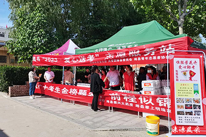 在考点等候区记者看到,志愿者们为考生设立了高考爱心加油站,备齐了矿泉水、应急药品、文具用品等助考物品,减少考生后顾之忧。同时还为考生们送上500束向日葵,寓意“一举夺魁”。志愿者们主动参与人群疏导、秩序维护等工作,为提前熟悉考场环境的考生营造畅通、有序、安静的考试环境。
