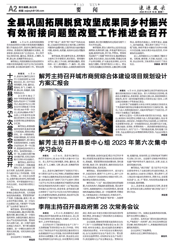 本报讯 6月14日,县委书记解芳主持召开十五届县委第54次常委会会议。县上及开发区领导葛凯、孙晓、董宏运、程海龙、孙飞、王虓恒、马辉、薛云涛、张栖源、吴栋等参加会议。