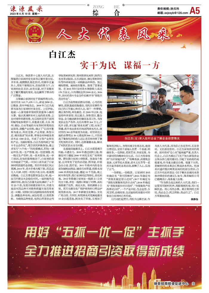 以行动扛起责任,用担当诠释忠诚。作为县人大代表,因为自己生在农村,长在农村,又扎根在农村,白江杰深知农村的现状。面对农村“空心化”越来越严重,在县人代会上,白江杰提出了《关于加大新型农业主体扶持力度的建议》,引起了县政府的高度重视,作为重点建议办理。每逢下大雨,县城里的雨水都会汇聚成洪水西流,经涑水河道冲毁河畔焦家涧村的部分农田,白江杰针对此状提出《关于解决县城雨水排放冲毁农田的建议》,如今,绛县城投公司已勘测设计,准备施工治理。