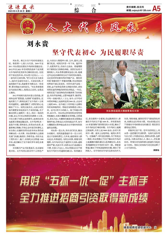 积跬步以至千里。在平凡的岗位上,刘永贵一直把履行代表职责、发挥代表作用与自己的工作紧密结合,想群众所想、急群众所急,当群众的知心人、贴心人,把扎根农村,带领乡村发展和群众致富作为他的奋斗目标,用自己的实际行动完美诠释了人大代表本色。