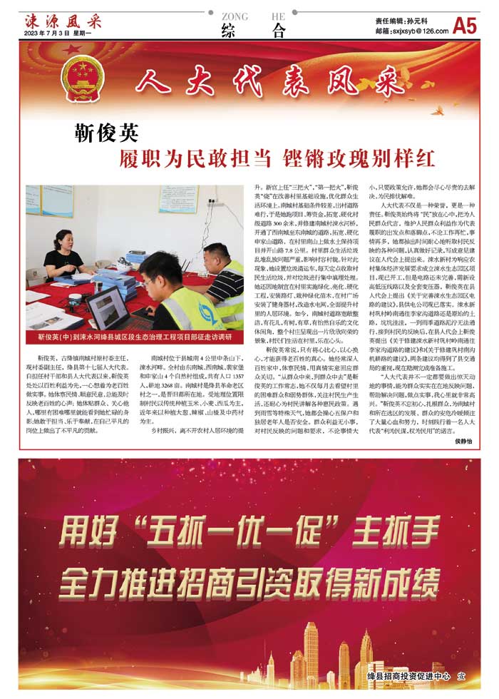 “人大代表并不一定都要做出惊天动地的事情,能为群众实实在在地反映问题,帮助解决问题,做点实事,我心里就非常高兴。”靳俊英不忘初心,扎根群众,为南城村和所在选区的发展、群众的安危冷暖倾注了大量心血和努力,时刻践行着一名人大代表“利为民谋,权为民用”的诺言。