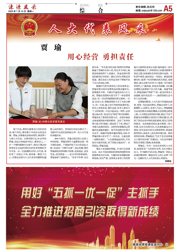 贾瑜说,作为一名来自农村的人大代表,就是要为广大的农民发声,为乡村振兴助力。作为新时代的女性,贾瑜用一种自立自强的精神和一颗奋发向上的心诠释了作为一名新时代人大代表的初心和使命。