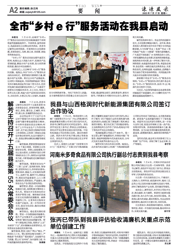 本报讯 7月12日,县委书记解芳主持召开十五届县委第55次常委会会议。县领导李翔、葛凯、荣亿、孙晓、董宏运、王虓恒、申东明、薛云涛、张栖源等参加会议。