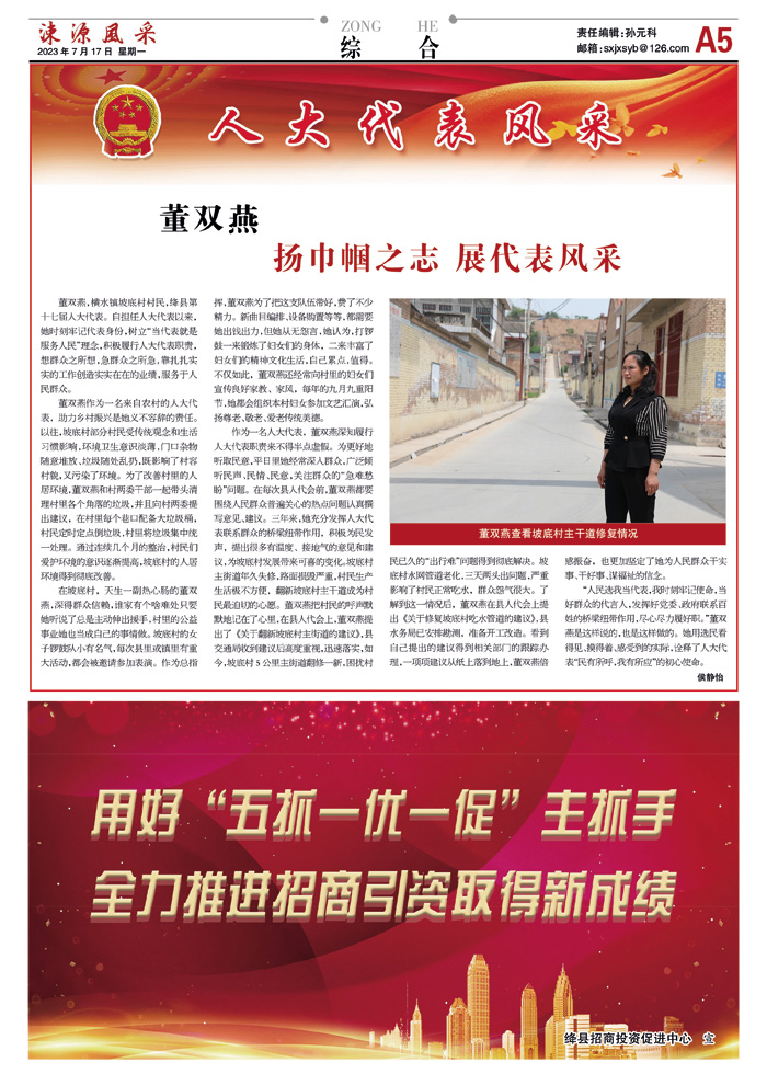 “人民选我当代表,我时刻牢记使命,当好群众的代言人,发挥好党委、政府联系百姓的桥梁纽带作用,尽心尽力履好职。”董双燕是这样说的,也是这样做的。她用选民看得见、摸得着、感受到的实际,诠释了人大代表“民有所呼,我有所应”的初心使命。