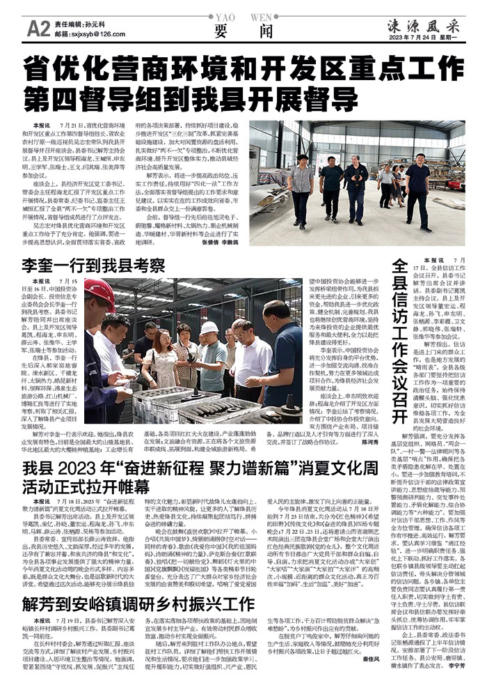 本报讯 7月15日至16日,中国投资协会副会长、投资信息专业委员会会长李奎一行到我县考察。县委书记解芳陪同并出席座谈会。县上及开发区领导葛凯、程海龙、申东明、薛云涛、张维华、王学军、张瑞士等参加活动。