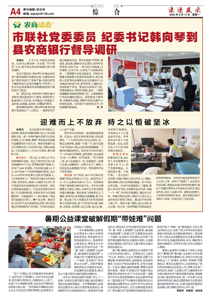 本报讯 8月9日,市联社党委委员、纪委书记韩向琴一行采取“四不两直”方式,轻车简从到县农商银行进行督导调研。