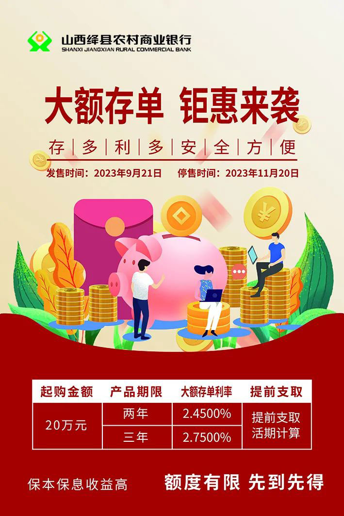 县农商银行大额存单2023年9月21——11月20日火爆发售。