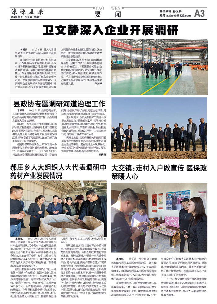 本报讯 11月1日,县人大常委会副主任卫文静带队深入部分企业开展调研。