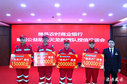 天龙救援队队长李建峰表示,希望进一步密切与农商银行的共同合作,共谋发展,共同探索互带互补新方法、新途径,更好的为服务人民群众、助力地方公益事业贡献力量。