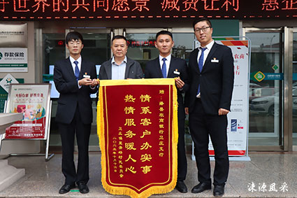 几天后,老人委托包村干部李鹏辉将一面写有“情系客户办实事,热情服务暖人心”的锦旗送到了农商银行。