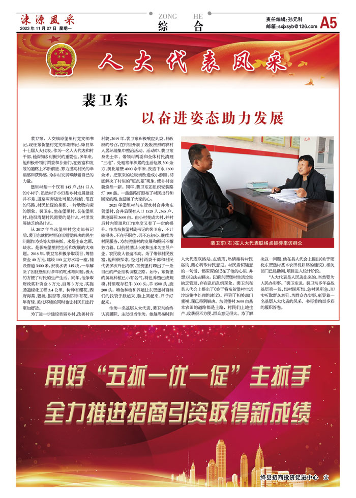 “人大代表是人民选出来的,当然要为人民办实事。”裴卫东说。裴卫东多年奋战基层第一线,想村民所想、急村民所急,切实听取群众意见,为群众办实事,彰显着一名基层人大代表的风采,书写着绚烂多彩的履职答卷。