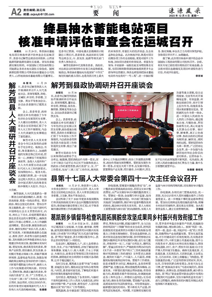 本报讯 11月29日,绛县抽水蓄能电站项目核准申请评估审查会在运城召开。县委书记解芳出席活动并致辞。山西省能源局新能源处副处长崔建,省发改委能源发展处陈明,中国国际工程咨询有限公司能源业务部水电处副处长徐佳成,国网新源控股有限公司绛县抽水蓄能分公司负责人、山西垣曲抽水蓄能有限公司董事长、党委书记贺涌,中国电建北京勘测设计院副总工周长兴,县委常委、统战部部长马辉等出席会议,市、县发改、能源等相关部门负责人参加会议。