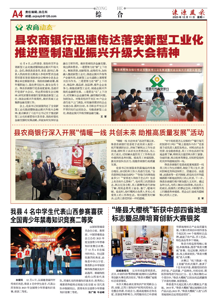 12月4日,山西省委、省政府召开全省新型工业化推进暨制造业振兴升级大会。会后,绛县县委委员、常委、副书记、绛县人民政府县长候选人李晓军要求迅速贯彻落实省委省政府会议精神全县各企事业单位根据省委、省政府战略部署,提升履职能力,强化责任担当,激发全员斗志。绛县农商银行党委高度重视,迅速召开党委扩大会议,传达贯彻落实会议精神,研究部署农商银行紧抓推进新型工业化、制造业振兴升级契机,做好县域工业集群金融支撑工作。