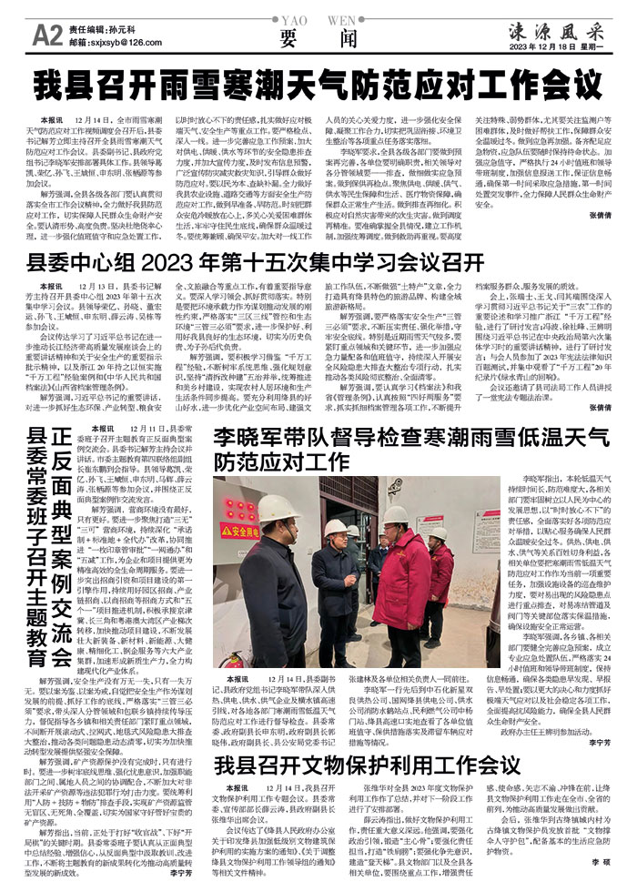 解芳强调,全县各级各部门要认真贯彻落实全市工作会议精神,全力做好我县防范应对工作,切实保障人民群众生命财产安全。要认清形势、高度负责。坚决杜绝侥幸心理,进一步强化值班值守和应急处置工作,以时时放心不下的责任感,扎实做好应对极端天气、安全生产等重点工作。要严格检点、深入一线。进一步完善应急工作预案,加大对供电、供暖、供水等环节的安全隐患排查力度,并加大宣传力度,及时发布信息预警,广泛宣传防灾减灾救灾知识,引导群众做好防范应对。要以民为本、查缺补漏。全力做好我县农业设施、道路交通等方面安全生产防范应对工作,做到早准备、早防范。时刻把群众安危冷暖放在心上,多关心关爱困难群体生活,牢牢守住民生底线,确保群众温暖过冬。要统筹兼顾、确保平安。加大对一线工作人员的关心关爱力度,进一步强化安全保障、凝聚工作合力,切实把巩固衔接、环境卫生整治等各项重点任务落实落细。