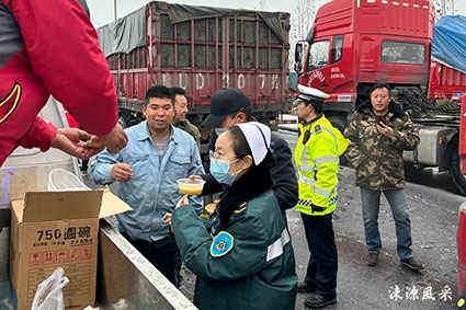 在现场,工作人员分别值守路段,疏导交通,对危化物品车辆进行登记,安抚滞留司机情绪;县工信科局、横水镇机关干部和横东、横南两个村的村“两委”干部组织志愿者们为滞留司机送上免费的蛋糕、面包、饼子、方便面、火腿肠和热米汤等物资;横水中心卫生院医务人员在各个点位待命,对有需求的旅客给予帮助;横水镇工会为滞留司机在爱心驿站准备了开水、休息室等,为滞留司乘人员提供力所能及的帮助。