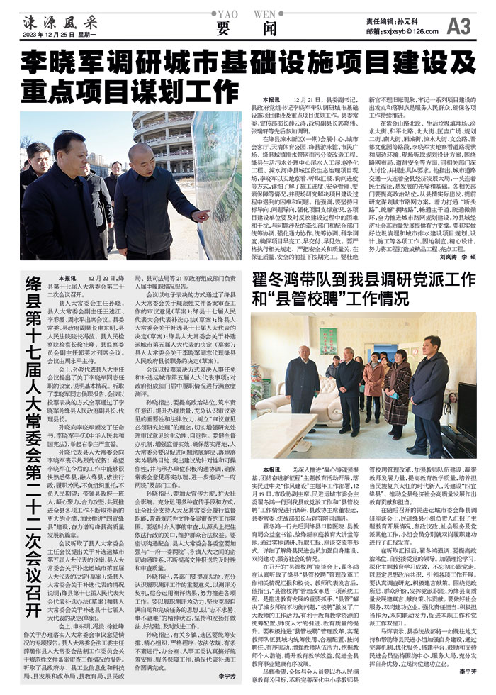 在紫金山路北段、生活垃圾填埋场、浍水大街、和平北路、北大街、匡吉广场、规划二街、南大街、厢城街、涑水大街、文公路、晋都文化园等路段,李晓军实地察看道路现状和周边环境,现场听取规划设计方案,围绕路网布局、道路安全等方面,同相关部门深入讨论,并提出具体要求。他指出,城市道路交通一头连着全县经济发展大局,一头连着民生福祉,是发展的先导和基础。各相关部门要提高政治站位,从县情实际出发,提前研究谋划城市路网方案,着力打通“断头路”、疏解“拥堵路”,畅通主干道,疏通微循环,全力推进城市路网规划建设,为县域经济社会高质量发展提供有力支撑。要切实做好垃圾填埋和城市排水建设项目规划、设计、施工等各项工作,因地制宜,精心设计,努力将工程打造成精品工程、亮点工程。